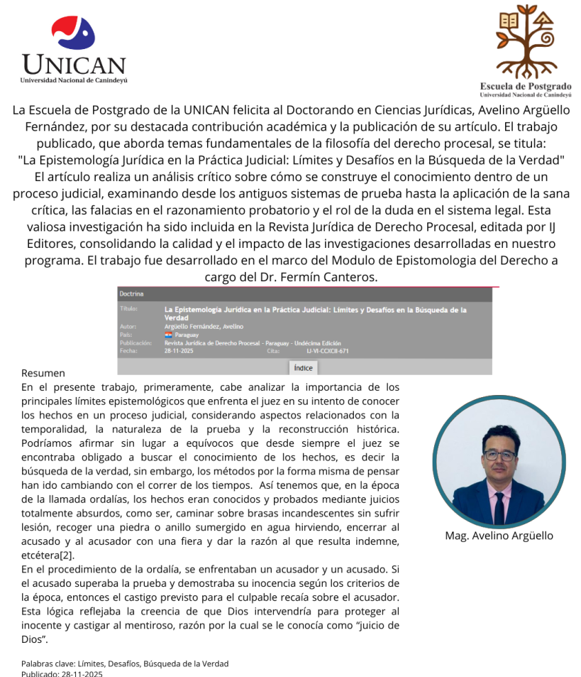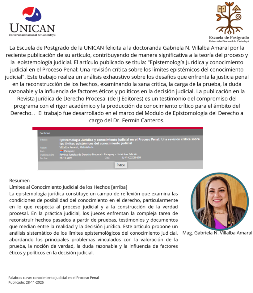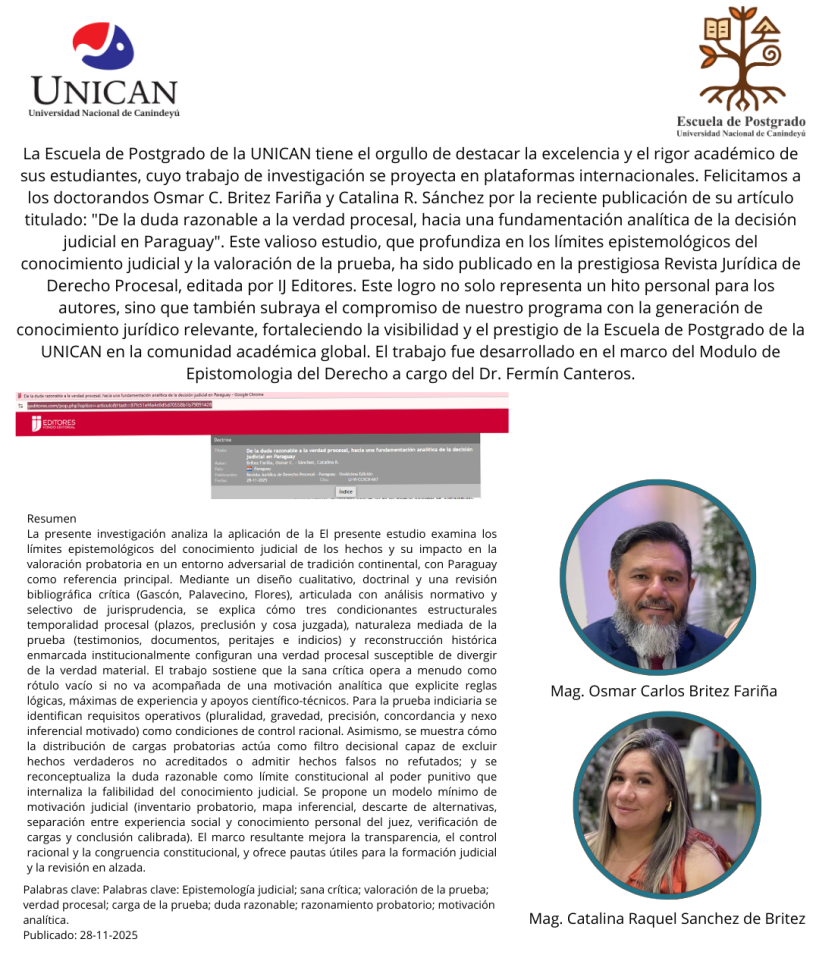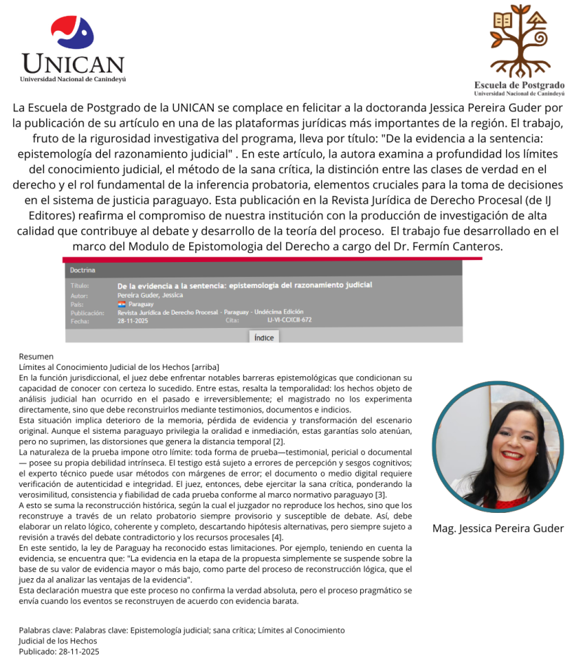 Cinco (5) doctorandos del Doctorado en Ciencias Jurídicas de la Escuela de Postgrado de la Universidad Nacional de Canindeyú (UNICAN) publicaron cuatro (4) artículos científicos en la Revista Jurídica de Derecho Procesal, editada por JJ Fondo Editores. Las publicaciones se realizaron en el marco de un trabajo desarrollado en el módulo de Epistemología del Derecho, a cargo del Dr. Fermín Canteros.