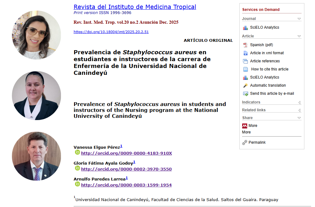 El artículo publicado lleva por título: “Prevalencia de Staphylococcus aureus en estudiantes e instructores de la carrera de Enfermería de la Universidad Nacional de Canindeyú”, y tiene como autores a la M.Sc. Gloria Fátima Ayala Godoy, la Dra. Vanessa Elgue Pérez y el Lic. Arnulfo Paredes Larrea.