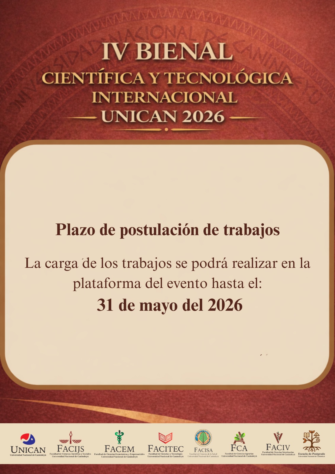 La Universidad Nacional de Canindeyú (UNICAN) invita a la comunidad en general a la IV Bienal Científica y Tecnológica Internacional-UNICAN 2026, con el lema “Ciencia: clave de transformación del presente y del devenir”, a realizarse en las fechas 17 y 18 de setiembre del corriente, en la UNICAN, sede Saltos del Guairá. El periodo de postulación de trabajos es hasta 31 de mayo del 2026.