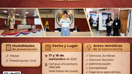 La Universidad Nacional de Canindeyú (UNICAN) invita a la comunidad en general a la IV Bienal Científica y Tecnológica Internacional-UNICAN 2026, con el lema “Ciencia: clave de transformación del presente y del devenir”, a realizarse en las fechas 17 y 18 de setiembre del corriente, en la UNICAN, sede Saltos del Guairá. El periodo de postulación de trabajos es hasta 31 de mayo del 2026.